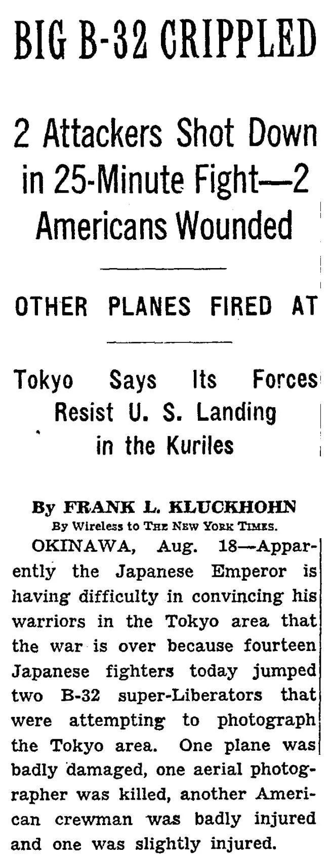 Air Combat near Tokyo: As you noted from the New York Times report, Japanese kamikaze attack an American photo-recon plane over Tokyo Bay — two U.S. crewmen are wounded, both Japanese planes are shot down.
